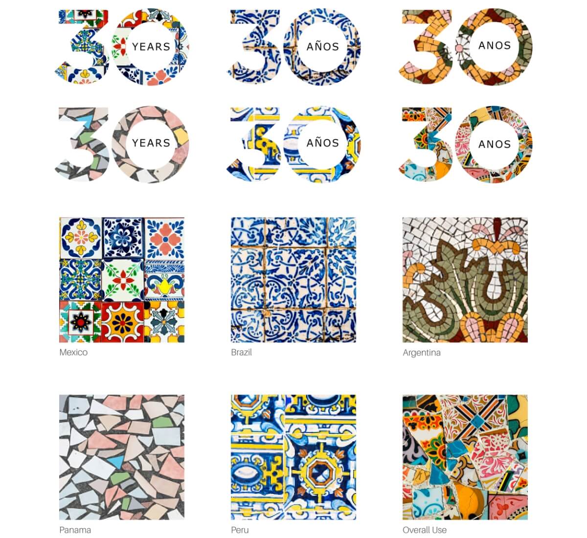 There are multiple versions of the LATAM 30 Years logo, making use of different mosaic styles. One version was selected for overall use, while other patterns are specific to individual Latin American countries.