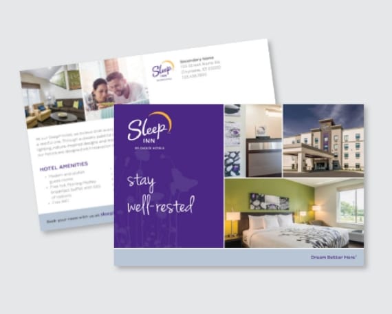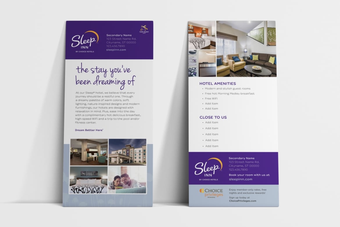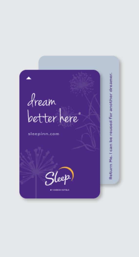 The team produced a refreshed color palette and a balance of clean, modern elements with organic shapes to appeal to travelers seeking a restful night’s sleep. The invigorated themes and elements would play out through all communications and collateral for a cohesive and strong new look. Sleep Inn’s new logo preserved the yellow moon concept but introduced a hand-drawn type for the word “Sleep.” The nature graphics and colors were essential to the updated creative development, living cohesively with the existing on-property interior design.