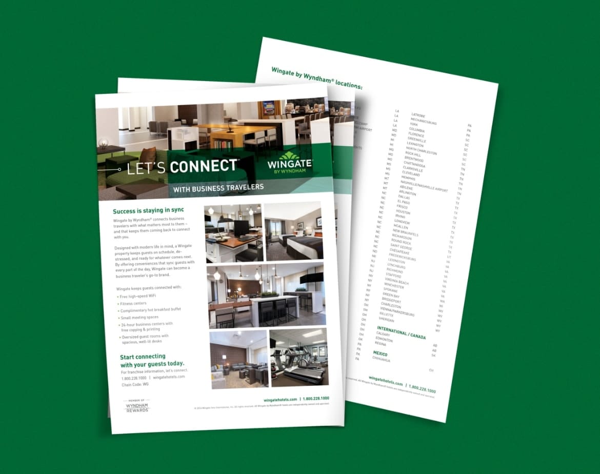 NM+U conducted an extensive brand analysis of their competition, to identify the essential core of Wingate by Wyndham’s brand identity and differentiators. Our team built a creative platform, centered under the tagline “LET’S CONNECT,” appealing to business travelers who want to stay productive, earn rewards, and maintain their busy routines in comfort.
